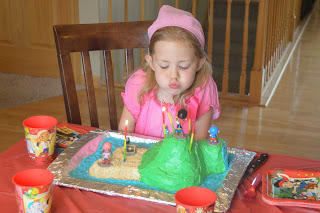 Poor Megan was sick with a nasty stomach bug from Sunday through Wednesday of this week, when I finally took her to the doctor. The doctor ruled out strep throat and appendicitis and said it must be a virus, but he was worried about dehydration so he prescribed her some Zofran. Her birthday was on Thursday, and she was still feeling pretty awful. She was finally able to keep Pedialyte and oyster crackers down on Thursday, with the help of the Zofran, but she spent the entire day on the couch watching tv and had two major tantrums because she was feeling so miserable. So we decided not to tell her that it was her birthday; instead, we told her that her birthday was on Saturday. She was feeling much better on Friday morning, and seems to be all the way back to normal today. Her pretend birthday today was a very nice day! She invited five friends over for a Jake and the Neverland Pirates birthday party, and everyone had a great time.